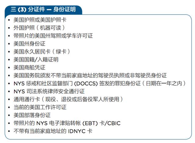 据小编的经验,单个护照已经是最方便的3分证件来证明身份,房屋租房合同也是比较方便的1分文件来证明居住在纽约市。只需带上护照和有自己名字和地址的房屋合同即可。
