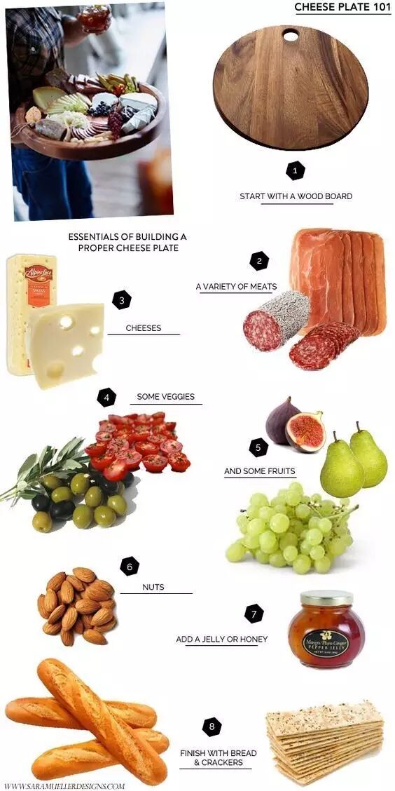 制作的方法很简单,只你要有个漂亮的,有气质的案板或者盘子。把自己喜欢的Cheese,水果,香肠,饼干,坚果摆放上去,就基本大功告成了!食物种类组合的创意可以无限多,Cheese Platter可以说是“超高的颜值”和“丰富的营养”兼备。是和朋友家中聚餐的一大利器,和某某家中小酌的最佳佐餐,随意拍一拍也可以在朋友圈秒杀一片。
