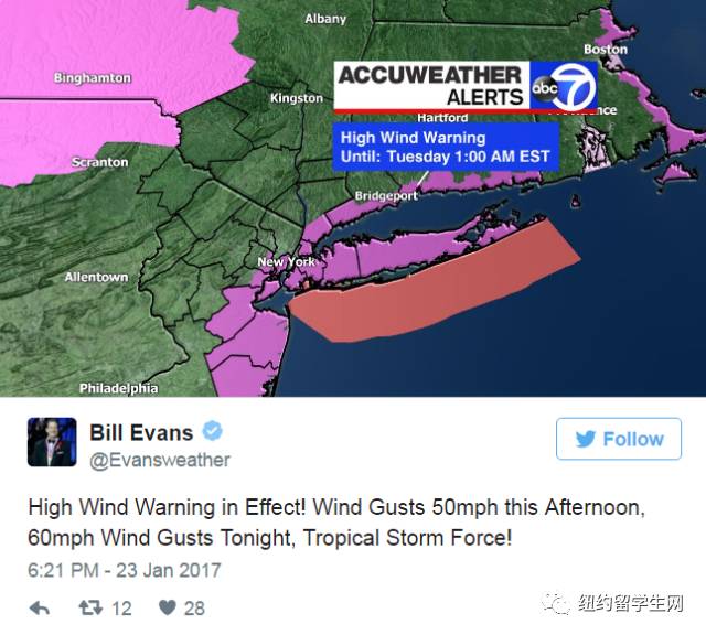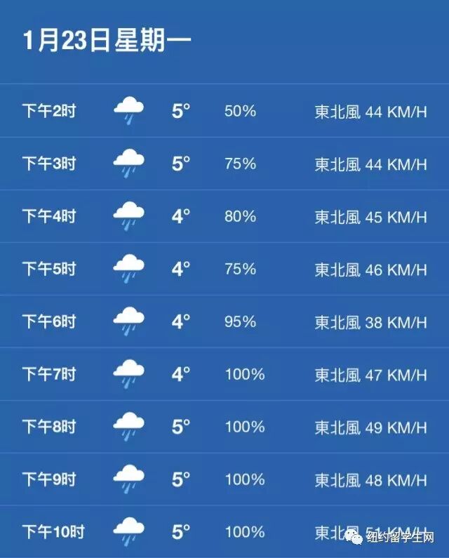 今天一早,便发现纽约的天空雾蒙蒙的一片。实际上,东北气旋带来的潮湿天气已经持续两天了。在1月24日星期一的下午三点,大规模降雨会开始,到晚间变为暴雨,预计积水将高达4英寸。国家气象局已经周一上午发布了高风警告,这一警告将持续到周二凌晨1点。