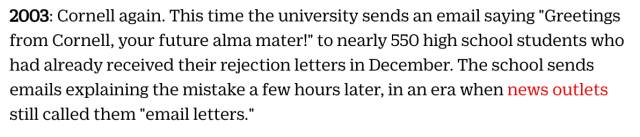 错发录取通知的现象频繁出现,引人担忧。约翰斯·霍普金斯大学于去年12月、瓦萨尔学院在2012年、弗吉尼亚州的克里斯托弗·纽波特大学在2011年、乔治·华盛顿大学在2010年,以及北卡罗来纳大学在2007年都犯过上述错误。2009年,加利福尼亚大学圣迭戈分校意外地给每一位申请该校的学生——其中包括2.8万名已经遭到拒绝的学生——发送了电子邮件,告知他们已被录取。