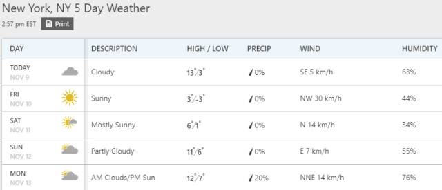 在正式进入严冬之前,气温还是会有很大幅度变化的,虽说穿着羽绒服的碰见别人穿短袖的事在纽约的街头并不鲜见,但是,希望我们不要成为穿错版本的那一个。