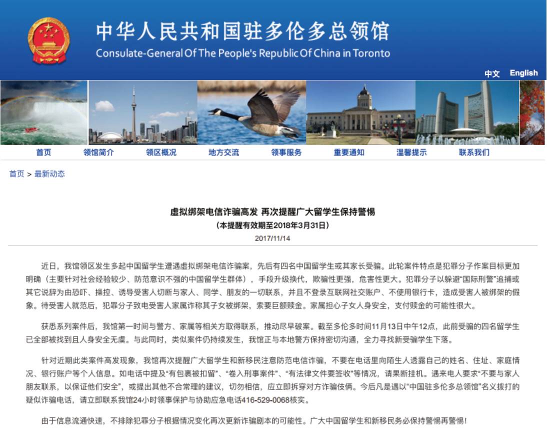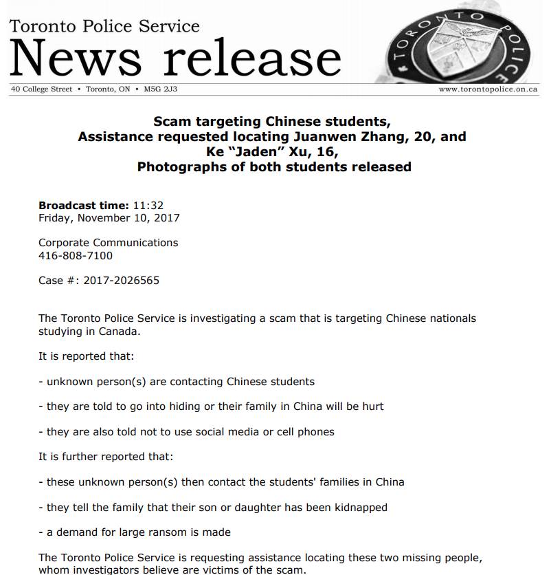 而在11月10日第三名留学生失踪消息发布后,案情发生转变,加警方表示怀疑这几位中国学生被卷入了绑架欺诈案。有消息表示:有陌生人通过电话接触到了一些中国学生,以其涉及境外犯罪为由,要求学生本人配合调查,停止一切对外联系:关闭手机、停用社交媒体等。随后犯罪分子就趁这些学生失联的时候,联系他们在国内的家人,称孩子被绑架并索要巨额赎金。
