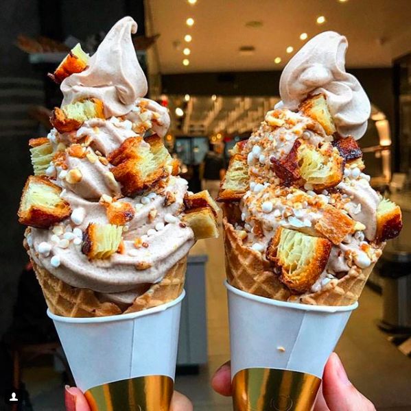 除了甜品小蛋糕,这家店的榛子冰激凌和黑芝麻冰激凌也很好吃而且颜值超高!上面搭配的是Kouign Amann法式焦糖奶酥块,冰淇淋和奶酥在嘴里融为一体的感觉,试过才知道有多美妙。