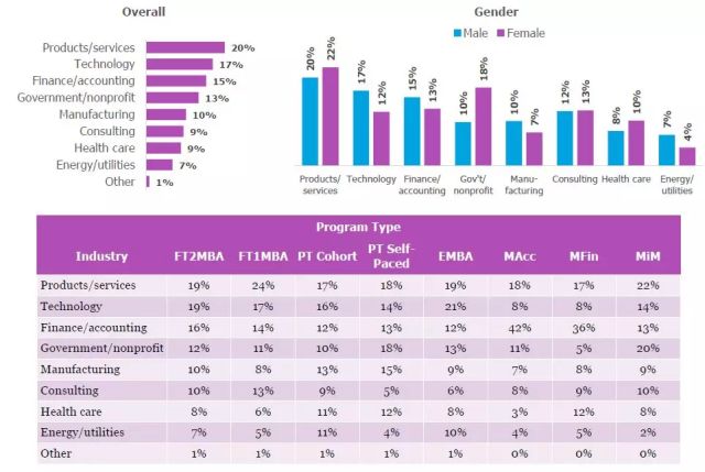 同时,商学院毕业生就业范围很广,占比较大的行业为:产品/服务(20%)科技(17%)财务/会计(15%)
