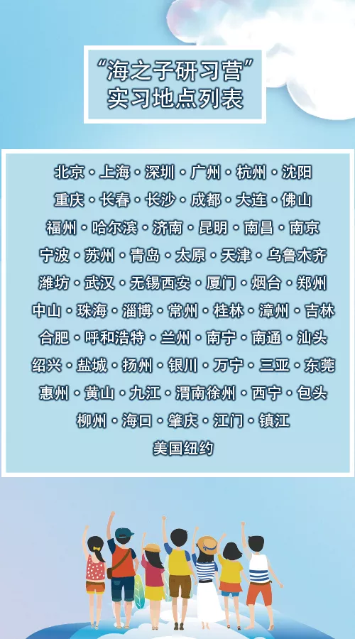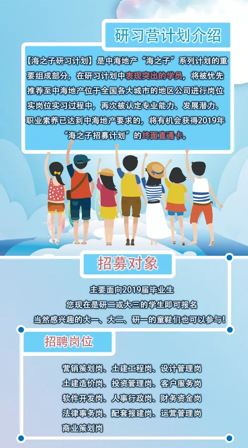 在研习计划中表现突出的学员,将被优先推荐至中海地产位于全国各大城市的地区公司进行岗位实习。岗位实习过程中,再次被认定专业能力、发展潜力、职业素养已达到中海地产要求的,将有机会获得2019年“海之子招募计划”的终面直通卡。