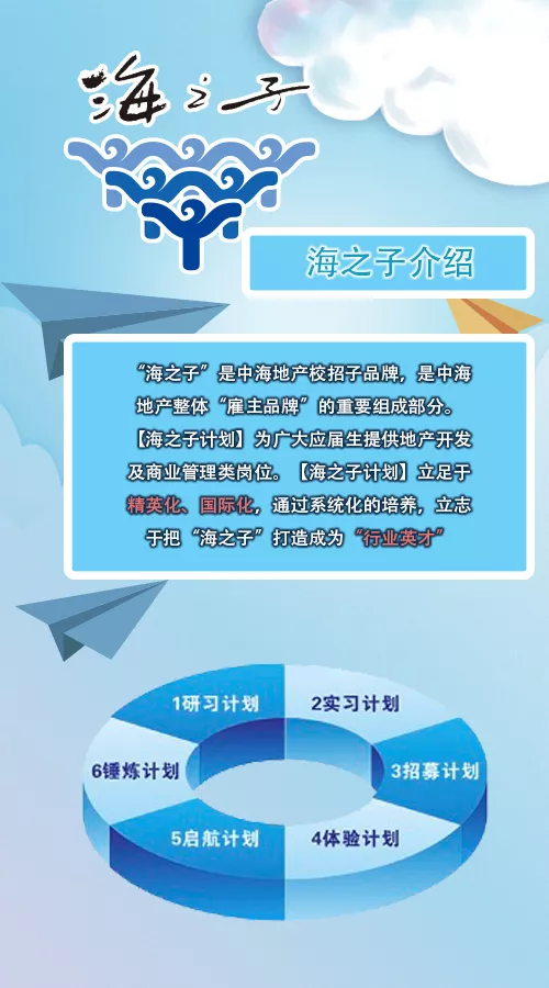海之子计划不光旨在为广大应届生提供地产开发及商业管理类岗位,更是立足于精英化、国际化,通过系统化的培养,立志于把“海之子”打造成为“行业英才”。
