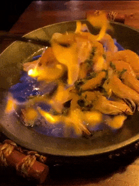 餐厅的中间摆了一张很长的桌子,能通过长桌的尽头可以看到厨房的小窗,看着主厨在满是火光的厨房里忙碌着,充满令人亲近的烟火气,让人仿佛瞬间穿越回国内热闹的路边摊旁。
