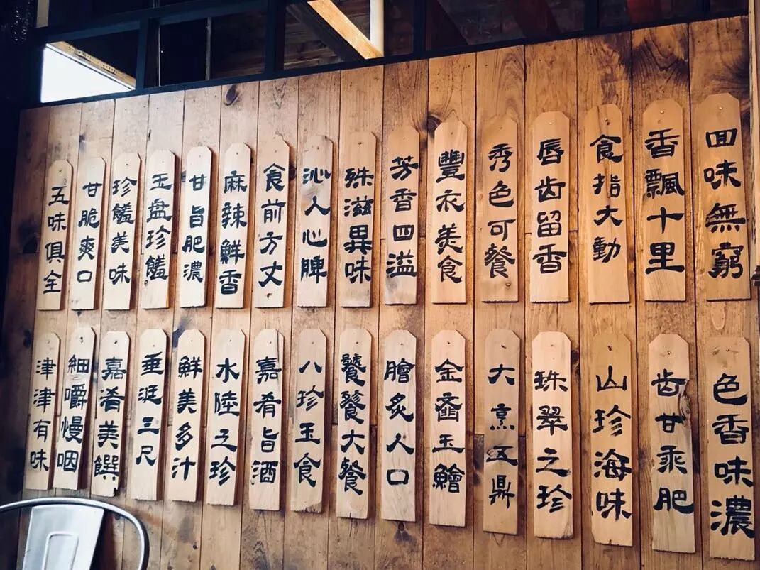 这家店主打休闲风,装潢充满着北京簋街风格,红砖墙上的挂饰韵味十足,带给客人一种不一样的新鲜感。一走进店里,映入眼帘的是一块钉来四十二个形容美味的四字成语,生动有趣!