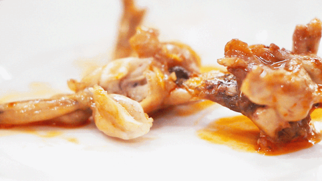 夹起一块蛙肉放入盘中,新鲜Q弹的肉感仿佛还住着蛙跳动的灵魂。蛙的肉质与鸡肉类似,但是更加细嫩,奇妙的口感让第一次吃到跳水蛙的某人大呼惊艳,此后的用餐过程,某人机会是将头埋在了盆里。
