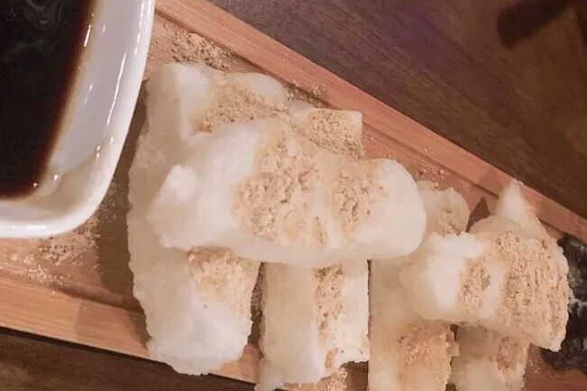 糍粑的外壳富有弹性,内里却是柔软绵密。撒上黄豆粉,沾红糖浆,咬一口撕扯开来,拉丝的口感仿佛在吃融化的芝士披萨。