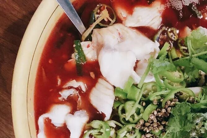 轻轻挑起一块嫩白的鱼肉,刚刚宰杀的鱼肉还保持的新鲜的细嫩口感。沾一下红油,立马送入口中,在鲜香的味道配以柔嫩的绝妙口感,简直吃到停不下来。