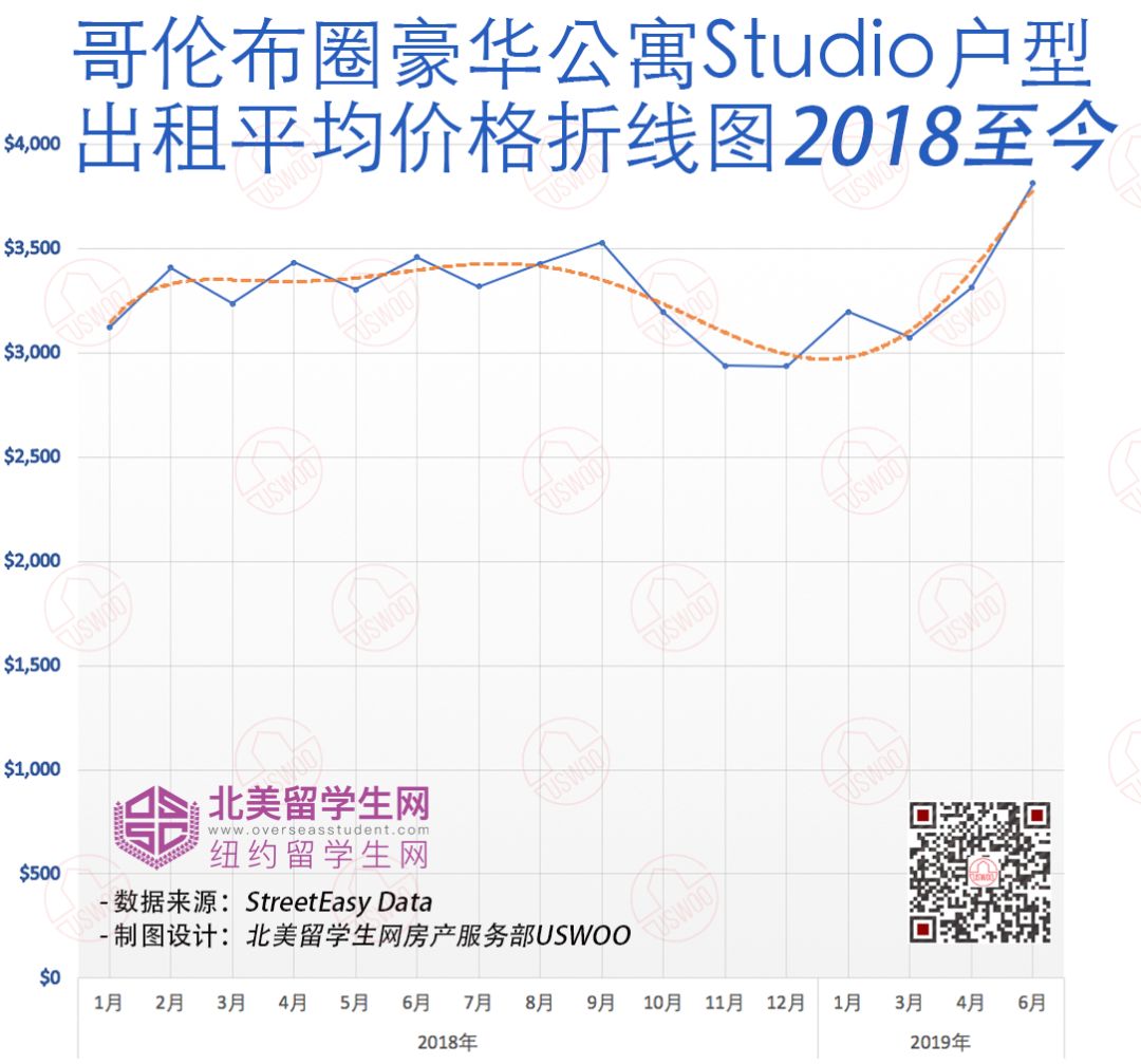 每年2月开始,以21 West End为代表的公寓的租金上涨,今年涨势从3月开始格外迅猛,结合我们手头的房源数据,2019 接下来 Studio 超过3750 美元/月是板上钉钉的事情;
